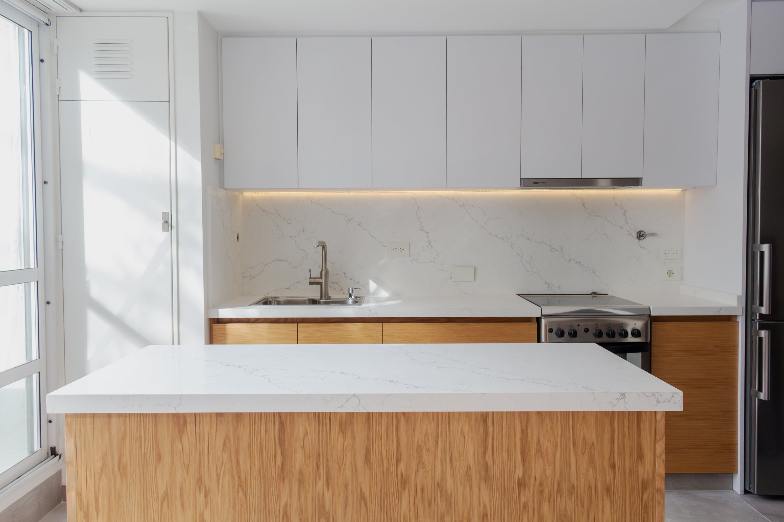 Los bajomesadas y la isla fueron fabricados en enhapado de Roble Americano lustrado, con terminacion extra mate